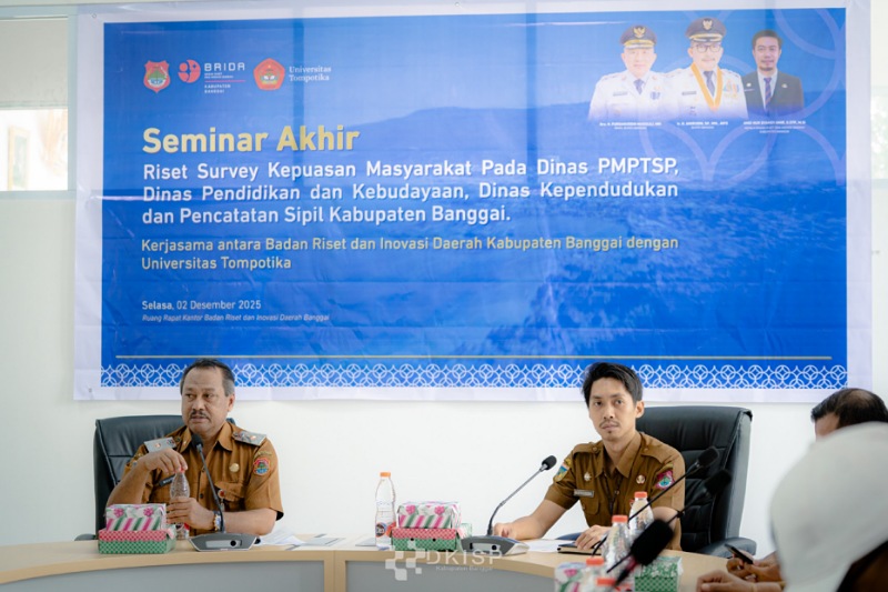 BANGGAI – Badan Riset dan Inovasi Daerah (BRIDA) gelar Seminar Akhir Riset Survey Kepuasan Masyarakat Pada Dinas PMPTSP, Dinas Pendidikan dan Kebudayaan, Kependudukan dan Pencatatan Sipil Kabupaten Banggai pada Selasa (02/12/2025) di Ruang Rapat Kantor Badan Riset dan Inovasi Daerah.